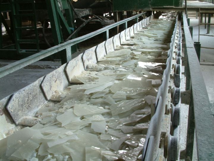 Step 2 – Making the final product After the reaction period either liquid or solid alum is made. If liquid, the concentrated batch is run into the dilution tank filled with the dilution water where it cools over time. The liquid alum is then filtered and pumped to storage. There are overhead load out facilities at Morrinsville where a number of liquid chemicals are available in dispatch tanks for road tankers. If solid is made, the concentrated alum is run into the casting pans where it sets, aided by fan cooling. The pans are forklifted to storage racks and from there they are taken to the Crushing Plant and dropped into a hopper. The pieces are broken further by a large kibbler followed by a small kibbler and then screened. Oversize particles go to a bagging hopper and are sold as kibbled product. The screened alum is rotary crushed and further screened to either return to the rotary crusher or be bagged as ground product. Dust is continually collected through an extraction system and is sold as product. The Crushing Plant is flexible and the ratio of kibbled to ground aluminium sulfate is variable.